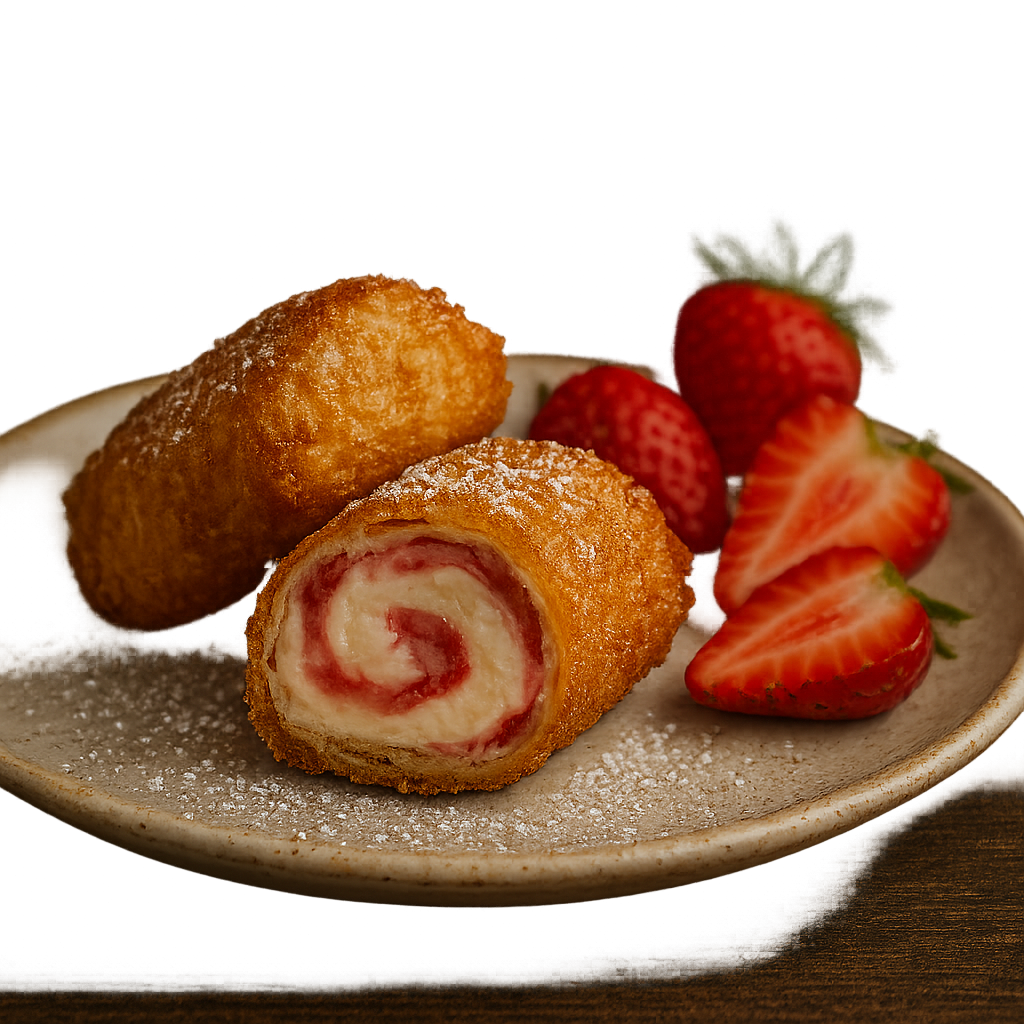 Creamy cheesecake wrapped in brioche, lightly fried to a golden crisp, and topped with fresh strawberries.