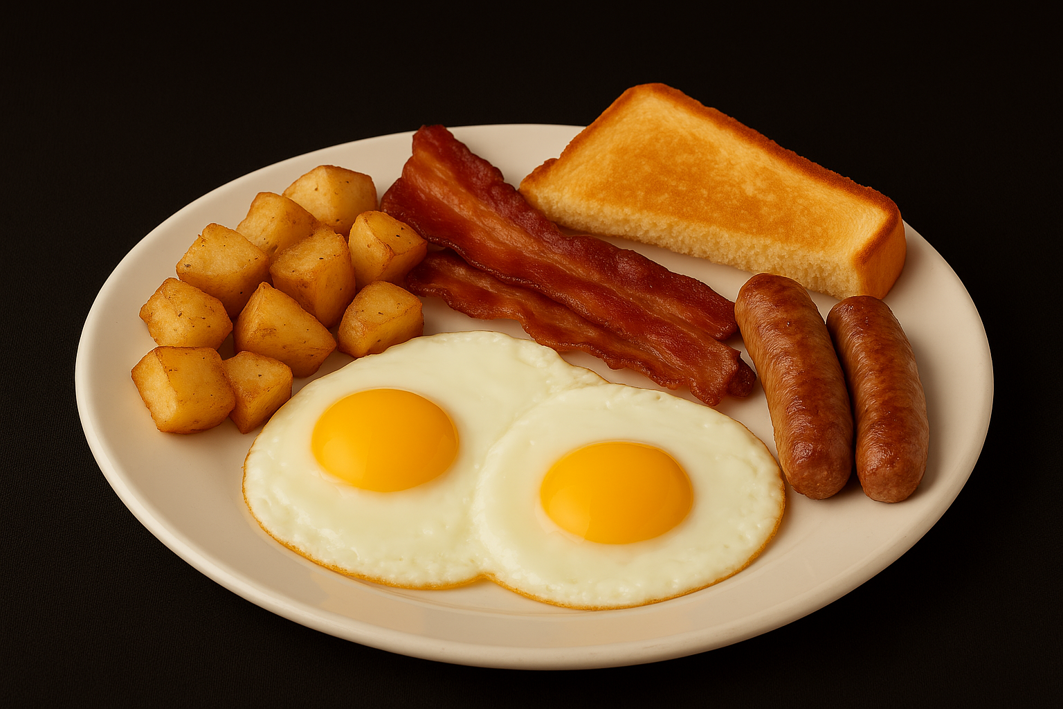 2 eggs, 2, bacon, 2 sausage links, home style fried potatoes, Texas toast.